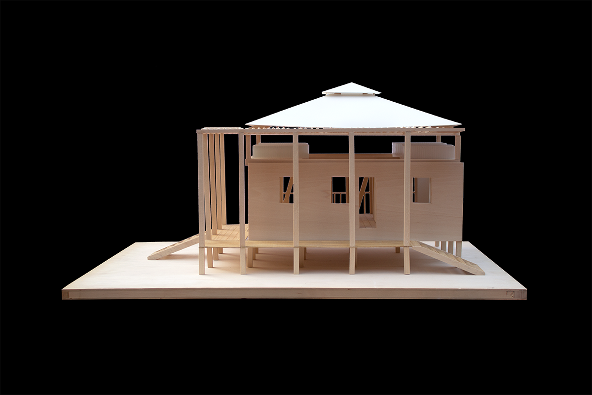 Elements of the house include solar power and rainwater collection, a specially-braced seismically-sound area, raised piers, and a veranda that is structurally separate from the roof. A system of rainwater tanks is structurally integrated with the roof such that the weight of the stored water can resist the hurricane-force winds acting on the roof during a severe storm.